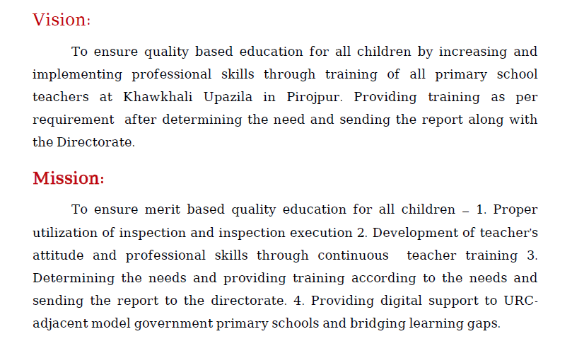 সকল শিশুর জন্য যোগ্যতাভিত্তিক মানসম্মত শিক্ষা নিশ্চিত করনের জন্য- (ক) পরিদর্শন ও পরিদর্শন কার্যকরণকে সঠিক ভাবে কাজে লাগানো (খ) ধারাবাহিক শিক্ষক প্রশিক্ষণের মাধ্যমে শিক্ষকবৃন্দের দৃষ্টিভঙ্গি ও চাকুরীকালীন পেশাগত উন্নয়ন। (গ) চাহিদা নিরূপণ করে চাহিদা অনুযায়ী প্রশিক্ষণ প্রদান করা এবং প্রতিবেদন সহ অধিদপ্তরের প্রেরণ। ঘ) উপজেলা রিসোর্স সেন্টার, ঝালকাঠি সদর, ঝালকাঠি এর সংলগ্ন মডেল স্কুলকে ডিজিটাল সাহায্য প্রদান ও শিখন ঘাটতি পূরণে সহায়তা করা।